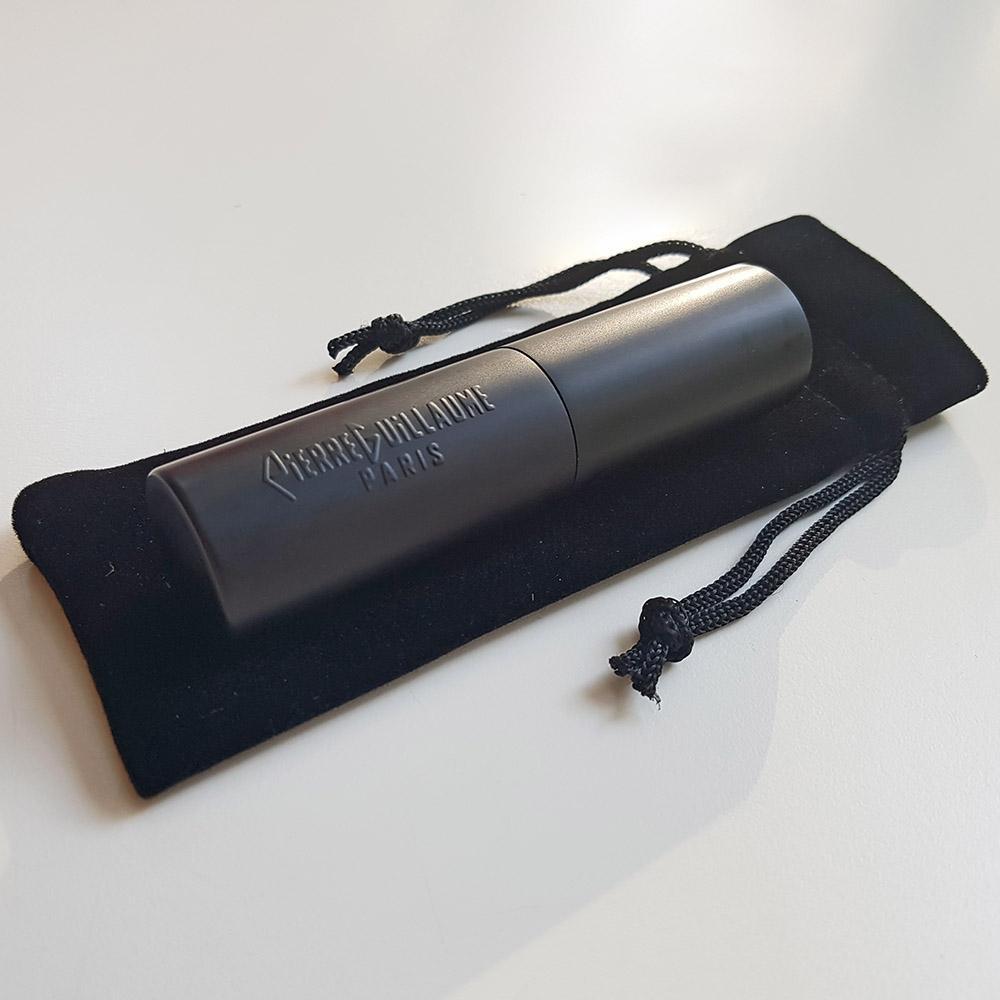 The metal case has a special ‘gun barrel’ finish with the Pierre Guillaume logo embossed on the side. To spray, turn the two metal parts in opposite directions, then the spray cap will appear. Comes with a luxurious velvet bag in which you can store your purse spray. Can be filled with any perfume. We do recommend limiting yourself to 1 scent per purse spray to avoid cross-contamination.
